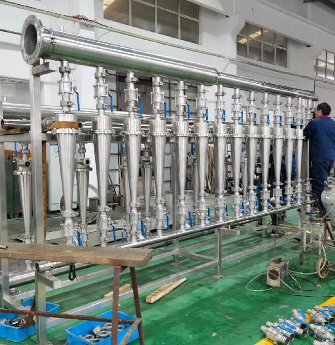 Microtec’s Starch Washing Hydro Cyclone is a critical component in achieving high-quality starch production by effectively washing out impurities such as fiber fragments, lipids, proteins, and dissolved substances from the starch slurry. This system employs a multi-stage, counter-current washing process that refines, concentrates, and recovers starch content before final dewatering and drying operations.