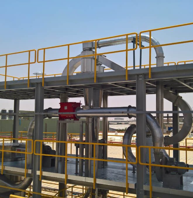 The flash drying process begins with the wet material being disintegrated into fine particles, which are then introduced into a heated air stream. The air temperature and flow rate are meticulously controlled to optimise drying efficiency without compromising product quality. As the material moves through the drying duct, moisture is quickly evaporated, and the dried particles are separated and collected in a highly efficient cyclone and bag filter system, which ensures low emissions and compliance with environmental standards.